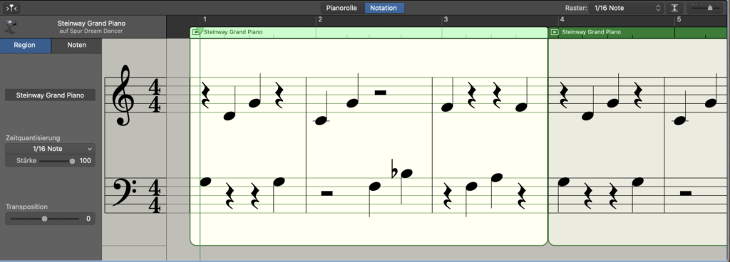 Wenn Du einen Track eingespielt hast, kannst Du den auch als Noten anzeigen lassen. Dazu gehst Du auf das Schnittfenster und wählst „Notation“ aus.