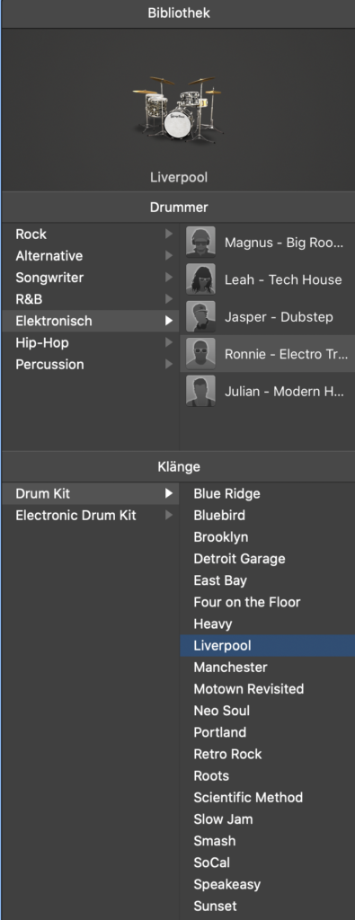 GarageBand gibt Dir die Mögichkeit, einen Drummer zu erstellen, der einen Stil spielt, den Du wünschst.
