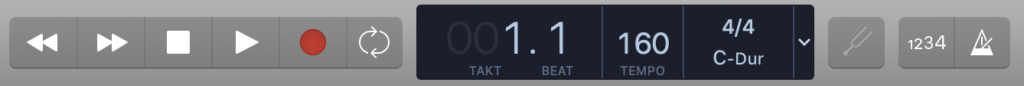 Der 1234 Button rechts zählt einen Takt an, bevor die Aufnahme beginnt. Das kleine Metronom ganz rechts aktiviert einen Klick, der im Takt spielt.