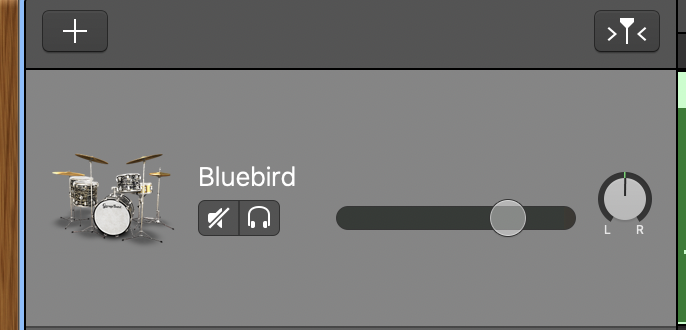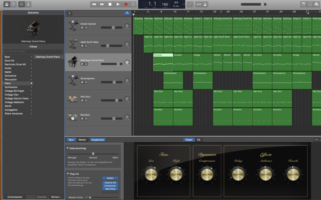 Wenn Du GarageBand öffnest, kann ein Projekt so aussehen. Ganz Oben sind die Grundelemente, mit denen Du das Projekt steuern und Fenster ein- und ausblenden kannst.Im linken Abschnitt siehst Du die Instrumente, welche zur Auswahl stehen. Oben in der Mitte befinden sich die Instrumente, welche aktuell aktiv sind. Rechts davon sind grün die Tracks, welche mit den Instrumenten eingespielt wurden. Unten sind momentan die Filter aktiviert.