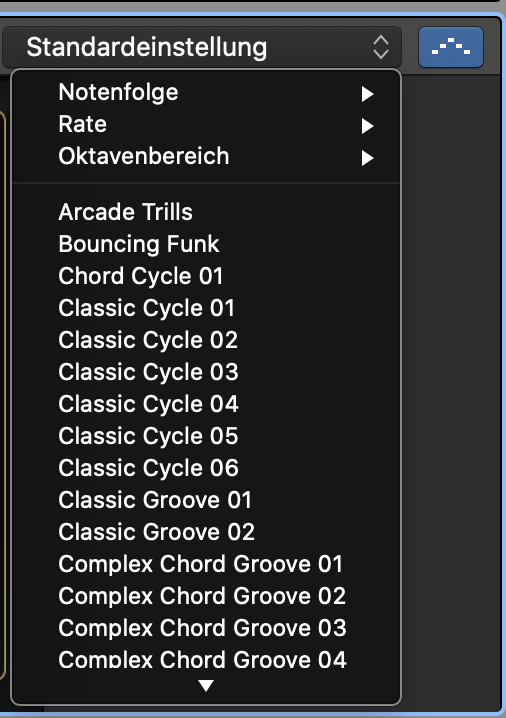 In der Filterfunktion hat es rechts oben noch eine weitere Funktion, welche Dir zur Verfügung steht. Mit dem Arpeggiator kannst Du eine Melodiefolge spielen. Die Töne Deiner Melodie werden in zufälliger Reihenfolge wiedergegeben. Du kannst verschiedene Styles auswählen: