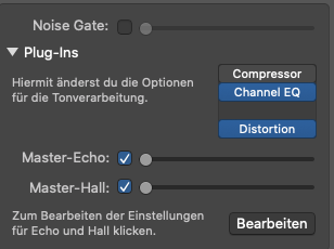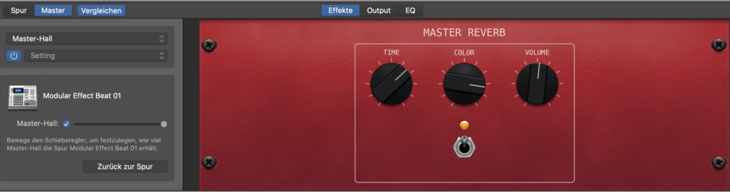 Der Master-Hall erzeugt einen Hall. Je stärker der Hall, desto grösser ist der gefühlte Raum, in dem die Aufnahme entstanden ist (z.B. kleiner Hall = grosses Zimmer, grosser Hall= Kirchenhalle)